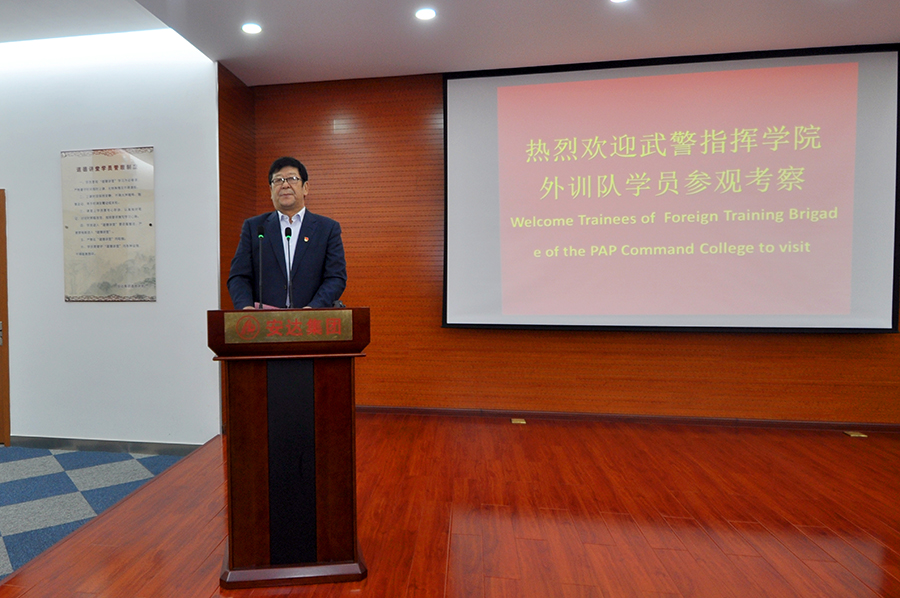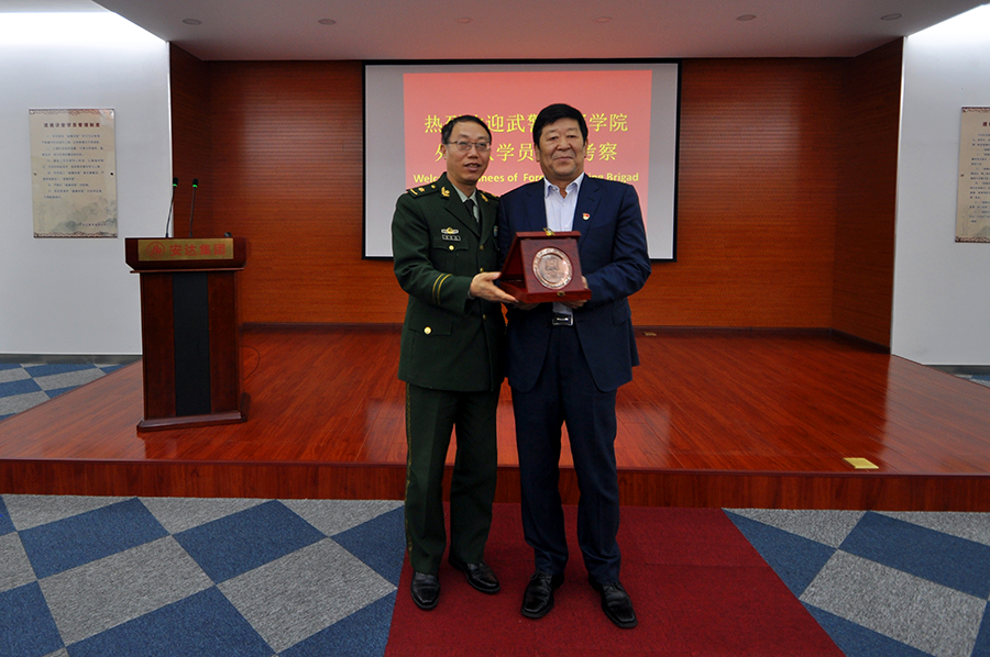 学员们首先来到道德讲堂,观看了企业宣传片,随后崔洪金发表了热情洋溢的讲话,崔洪金首先向大家介绍了华体会huatihui(中国)集团的发展历程及“四大板块”的经营成果,并就华体会huatihui(中国)集团多年来心系国防,拥军备战的军人情结有机的融入企业文化之中作出精彩诠释,他指出:“习近平总书记倡导的‘一带一路’伟大战略构想,是为了更好地构建人类命运共同体,实现全世界的共同发展和人民的共同富裕。华体会huatihui(中国)集团的产品已经远销到西亚、非洲、澳洲、南美洲等多个国家和地区,我们将借助‘一带一路’,走向更多的国家的地区,与更多的国家和地区建立商业往来,以更优的产品服务更多的用户、造福更多的人民。”崔洪金说:“我是一名退役军人,华体会huatihui(中国)集团更是先后安置过500余名退役军人在这里就业,我们与军人有着不解之缘。我愿意与你们所有人都成为朋友,并通过你们与你们国家的人民成为朋友。苏格兰有一首非常有名的诗歌,后来被谱为歌曲,在全世界广为流传,逐渐成为脍炙人口的名曲,翻译成中文名叫《友谊地久天长》,愿华体会huatihui(中国)与你们友谊地久天长,愿中国与你们的国家友谊地久天长!”武警指挥学院的领导及各国外训军官学员对崔洪金的讲话报以热烈掌声,武警指挥学院领导胡金红代表全体外训学员向崔洪金董事长赠送纪念徽章以示敬意。