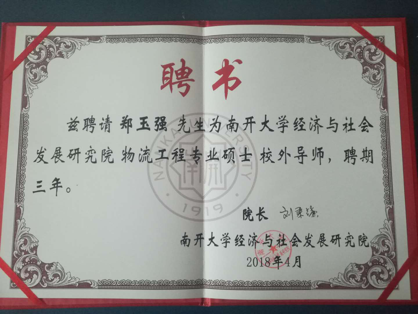 2018年4月27日,南开大学经济与与社会研究院院长刘秉廉教授向郑玉强颁发聘书,聘请郑玉强为研究院物流工程专业硕士校外导师,聘期为三年。