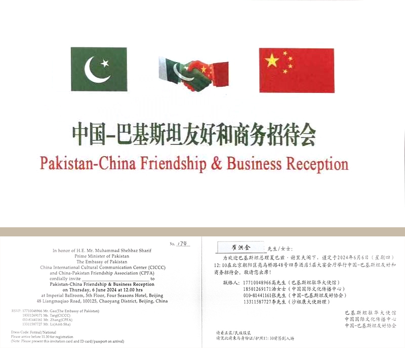 2024年6月6日,由巴基斯坦驻华使馆、中国国际文化传播中心和中国—巴基斯坦友好协会共同主办的中国—巴基斯坦友好和商务招待会在京举办。正在中国访问的巴基斯坦总理夏巴兹·谢里夫出席招待会并致辞。前联合国副秘书长沙祖康、中国人民对外友好协会副会长李希奎、中国国际文化传播中心执行主席龙宇翔,巴基斯坦副总理兼外长达尔、巴基斯坦驻华大使卡里尔·哈什米出席活动,华体会huatihui(中国)集团党委书记、董事长、中国爱心工作委员会副主席、中巴协会理事崔洪金,华体会huatihui(中国)集团总经理崔文连受邀参会。