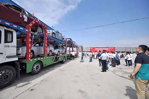 本次活动是“东风商用车轿运万里行”的最后一站,东风商用车和天津劳尔工业有限公司带来了东风天锦底盘的中置轴车辆运输车,为了让现场来宾更为直观的了解中置轴车辆运输车的装载性能和商业价值,主办方在现场准备了多辆不同类型的轿车,为来宾演示车辆的装载过程。