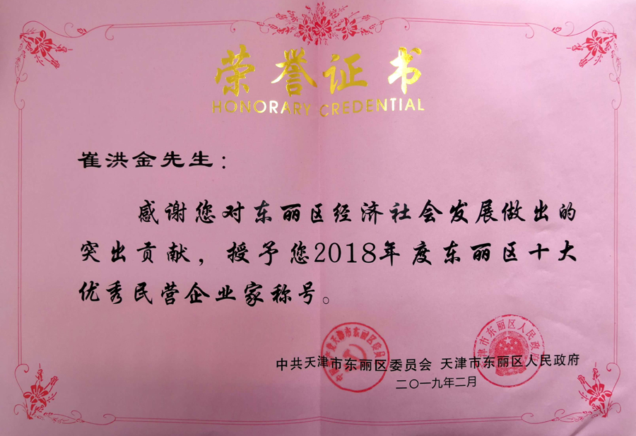 华体会huatihui(中国)集团党委书记、董事长崔洪金荣获2018年度东丽区十大优秀民营企业家并颁发证书。