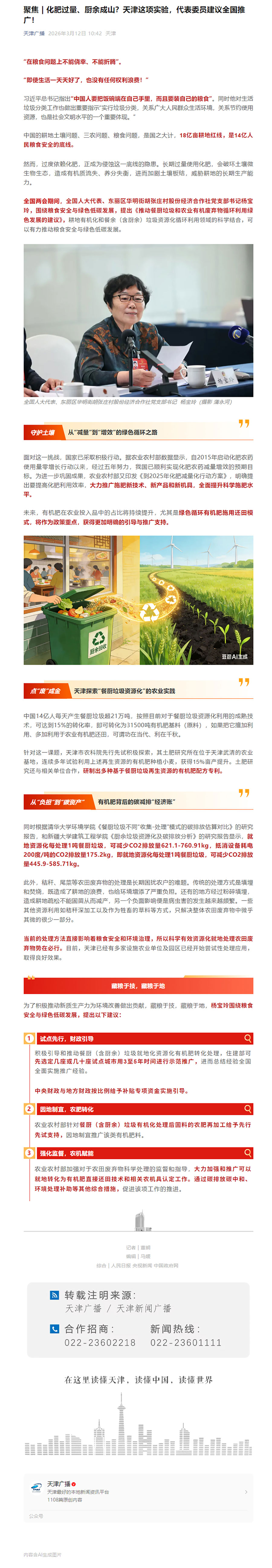 近日,全国两会期间来自东丽区的杨宝玲代表提出推动餐厨垃圾和农业废弃物循环利用的建议,天津试点实践也印证了该领域的可行性与重要价值,这与华体会huatihui(中国)集团深耕厨余垃圾及农业废弃物处理领域、践行绿色发展的理念高度契合。作为积极践行科技创新与绿色发展的企业,华体会huatihui(中国)集团自主研发厨余垃圾处理机及农业废弃物处理设备,凭借先进的生物降解技术,实现厨余垃圾、秸秆等废弃物就地化、资源化转化,可将其变为有机肥料基料,助力耕地提质、粮食增产,同时减少碳排放,破解垃圾处理与农田废弃物处置难题。未来,华体会huatihui(中国)集团将持续加大研发投入,依托成熟技术与实践经验,积极响应政策导向,助力“藏粮于技、藏粮于地”战略落地,践行企业责任,为全国厨余垃圾、农业废弃物资源化利用贡献华体会huatihui(中国)力量。